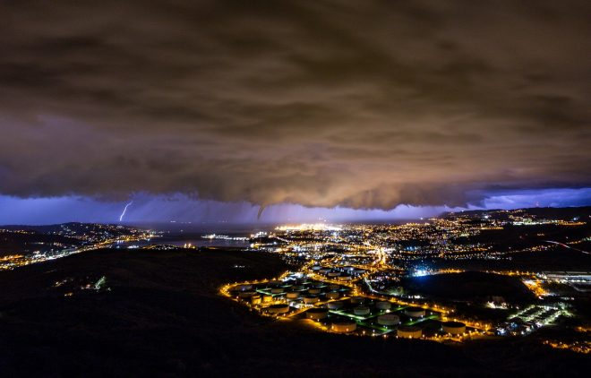 Vremenski fotograf Marko Korošec, ki sicer dela za vremensko spletno stran Severe Weather Europe, je fotografiral nebo nad Trstom v ponedeljek, 7.12.2020, ko je nad mestom divjala supercelična nevihta s točo in strelami. Vidimo lahko celo vrtinec oz. t.i. trombo.
